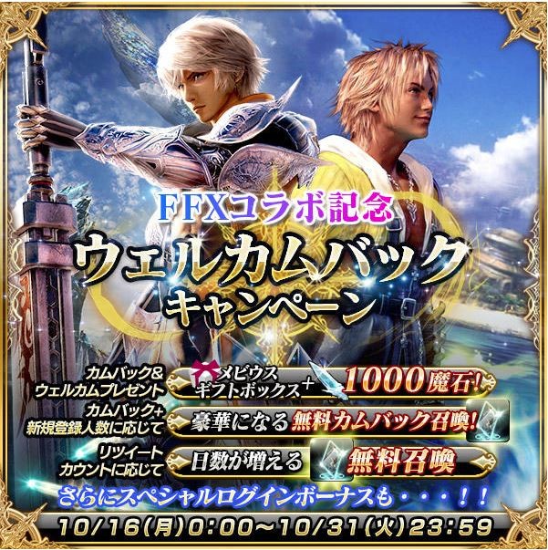 メビウス ファイナルファンタジー公式 浜口lです 生放送をご視聴いただきありがとうございます 1周年目前のメビウスffを盛り上げるべく 5月はff12とのコラボ企画を予定しております 合わせてウェルカムバックキャンペーンも開催します 一緒に1周年